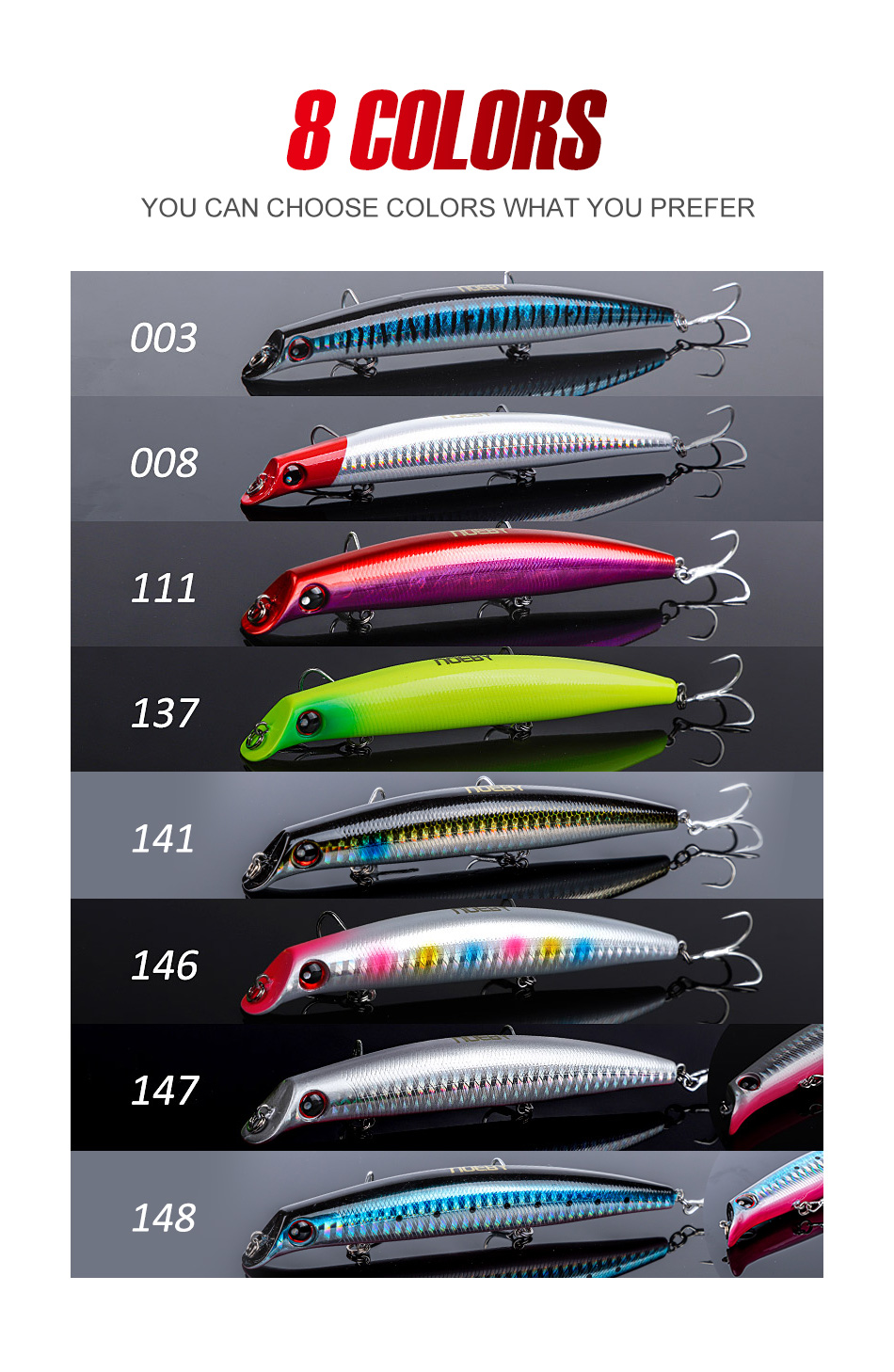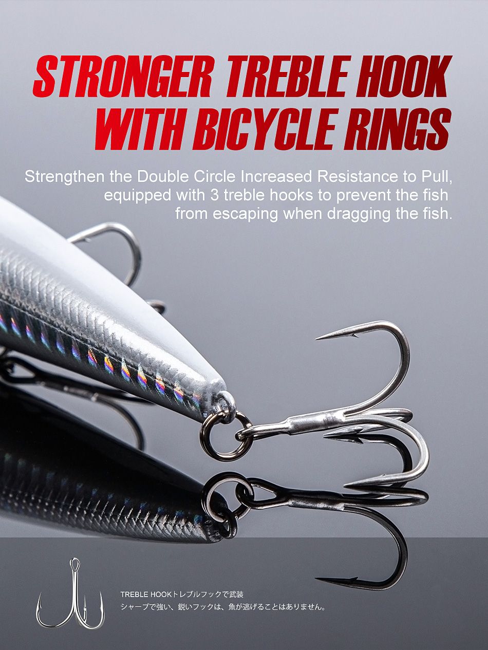 • Hooks: Saltwater-grade trebles with strong split rings