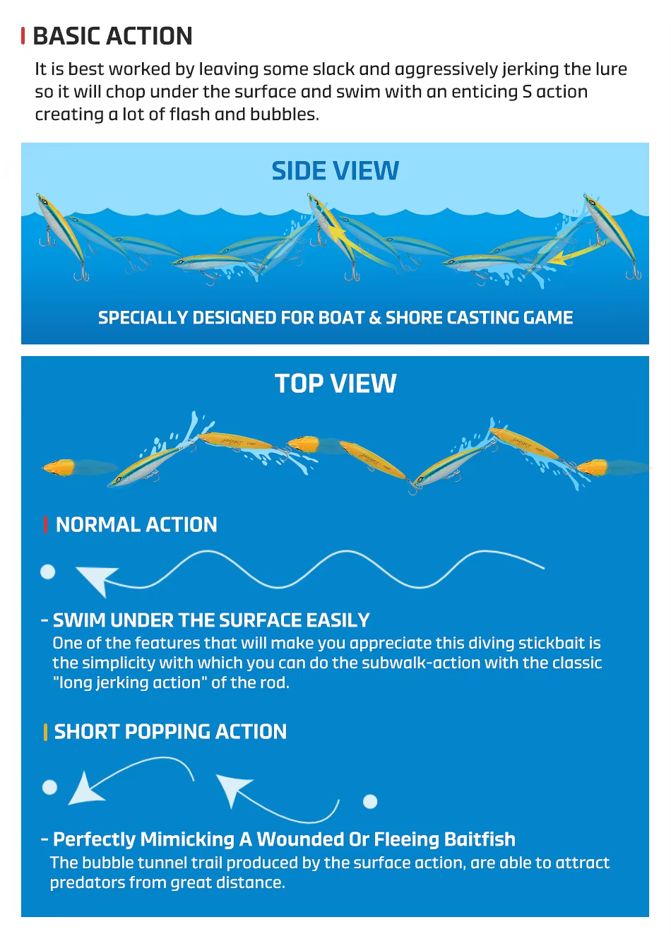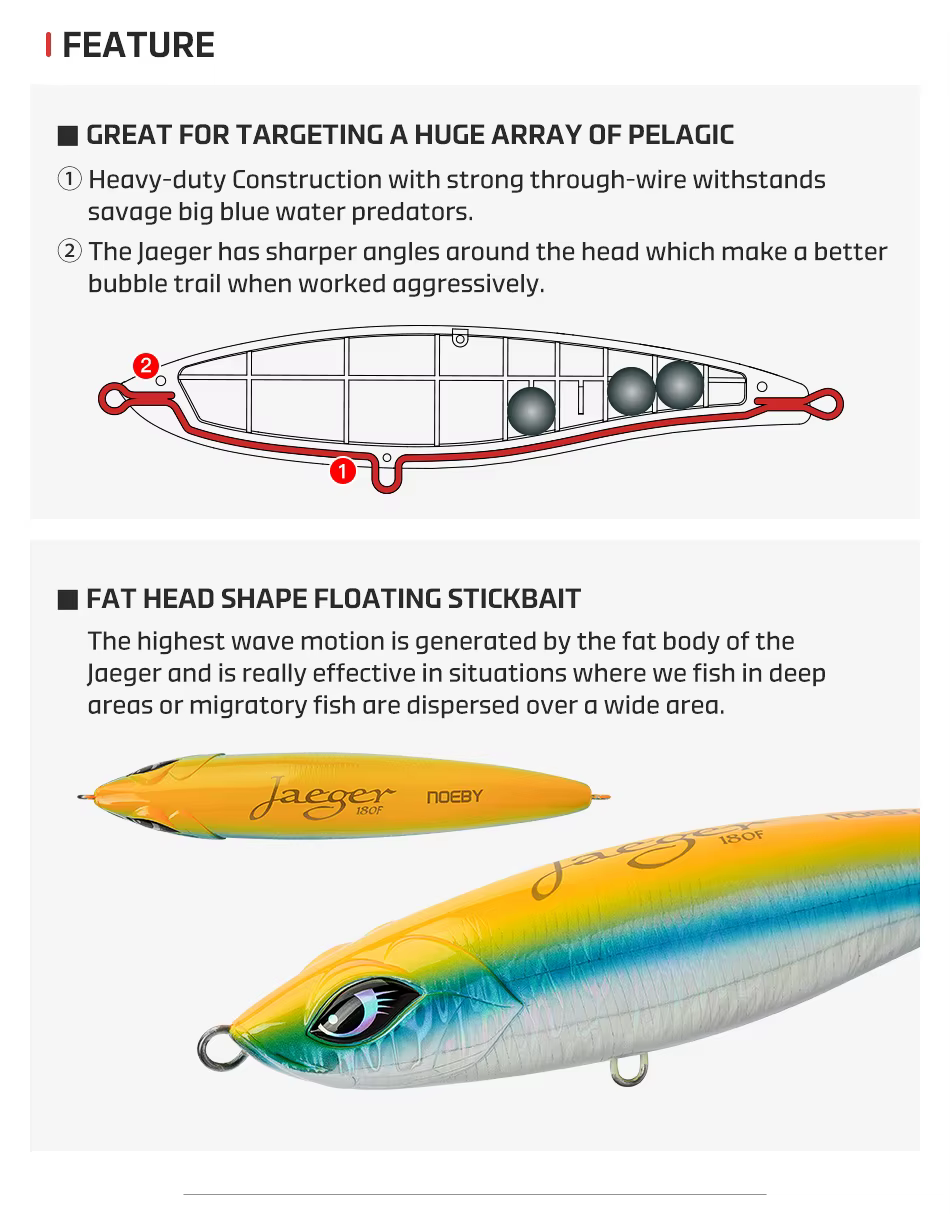 The Jaeger is a mid-weight floating stickbait built for versatility and responsiveness. With a refined balance between buoyancy and action, it excels in both aggressive sweeps and slower walk-the-dog glides. Whether you’re fishing over reef ledges or open bluewater, the Jaeger invites explosive surface strikes from GTs, kingfish, tuna, and other predators. Its streamlined silhouette and tail-weighted design offer long-distance casting without sacrificing control during the retrieve.