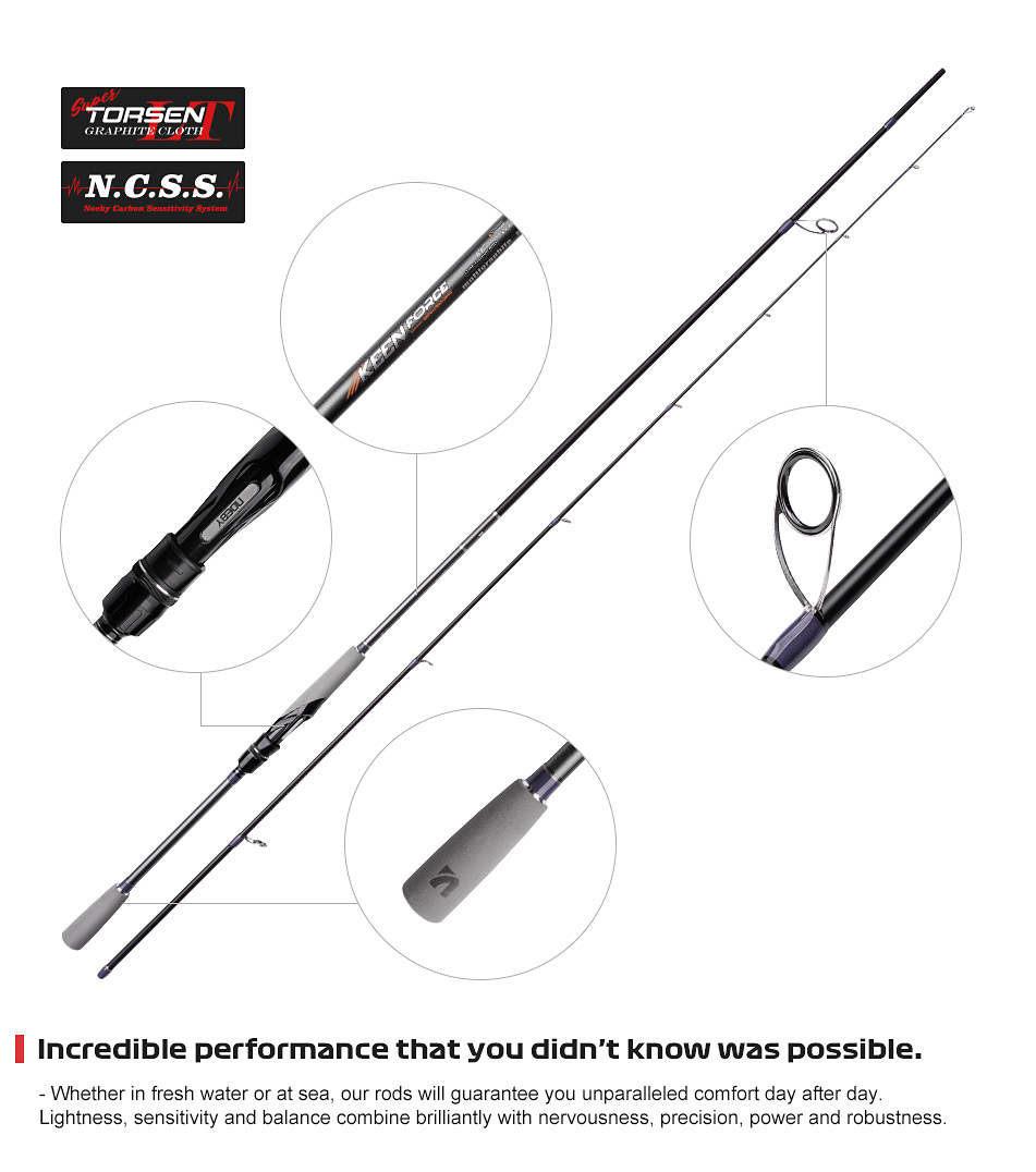 Lightweight Multi-Purpose Precision for Freshwater & Inshore Angling. The KEEN FORCE is a thoughtfully engineered spinning rod suited for anglers seeking finesse, range, and versatility. Available in L, UL, ML, and M power models, with lengths spanning 6’8” FT to 9’6” FT, this two-piece design balances lightweight manoeuvrability with the strength needed for coastal and lighter offshore techniques.