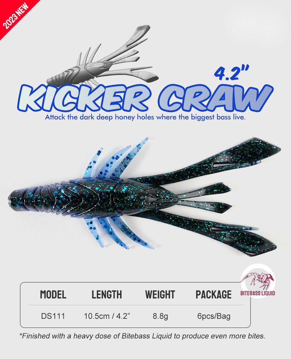 The Kicker Craw is a versatile creature bait designed to mimic the defensive posture of a crawfish, making it an ideal choice for bass and other predatory fish. Its compact body and flared claws create a subtle yet enticing action, perfect for flipping, pitching, or as a jig trailer. It features a unique air-chamber.