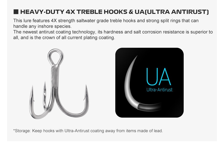- Hooks: 4Xstrength saltwater treble hooks, antirust coating with strong split rings