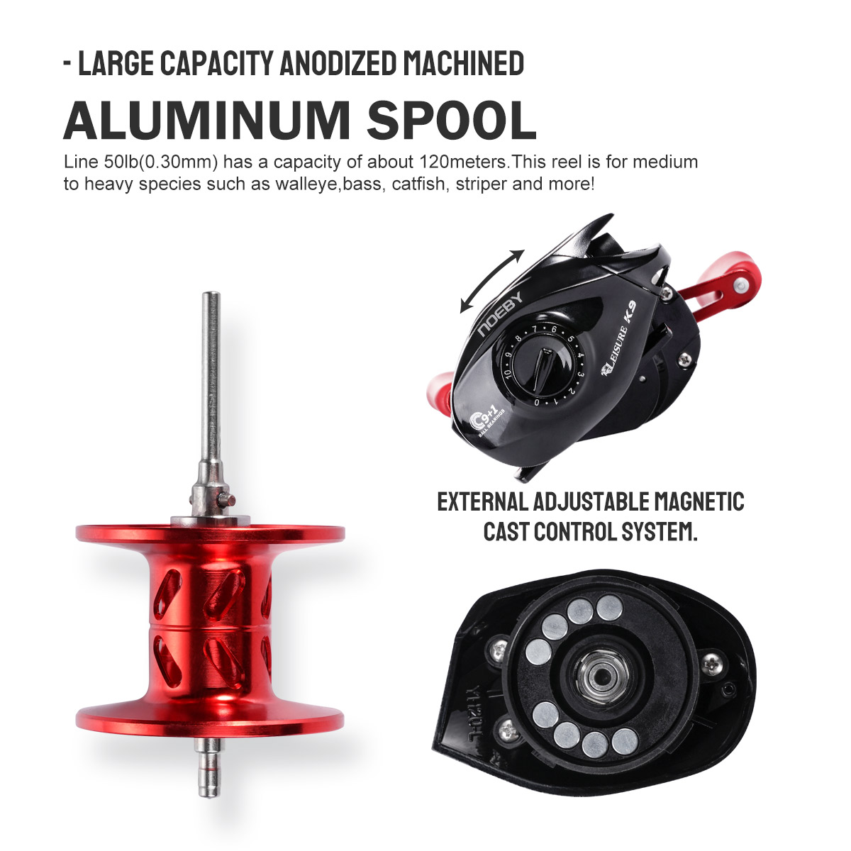The Leisure K9 is a lowprofile is great for casting lighter lures. With a 7.1:1 gear ratio and a robust 7 kg max drag, it offers quick line pick-up and solid stopping power for its class. The reel operates on a smooth 9+1 stainless steel ball bearings system and features brass main and pinion gears, delivering dependable smooth performance in aggressive scenarios. A multi-piece carbon fibre brake system ensures adjustable, strong braking force for controlled casting.