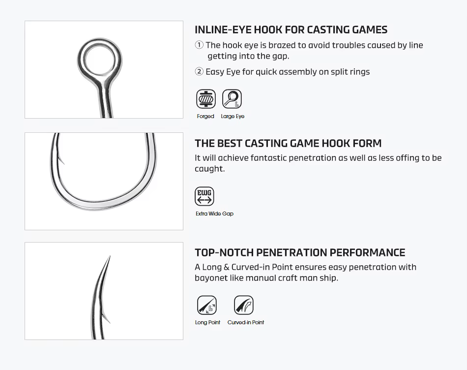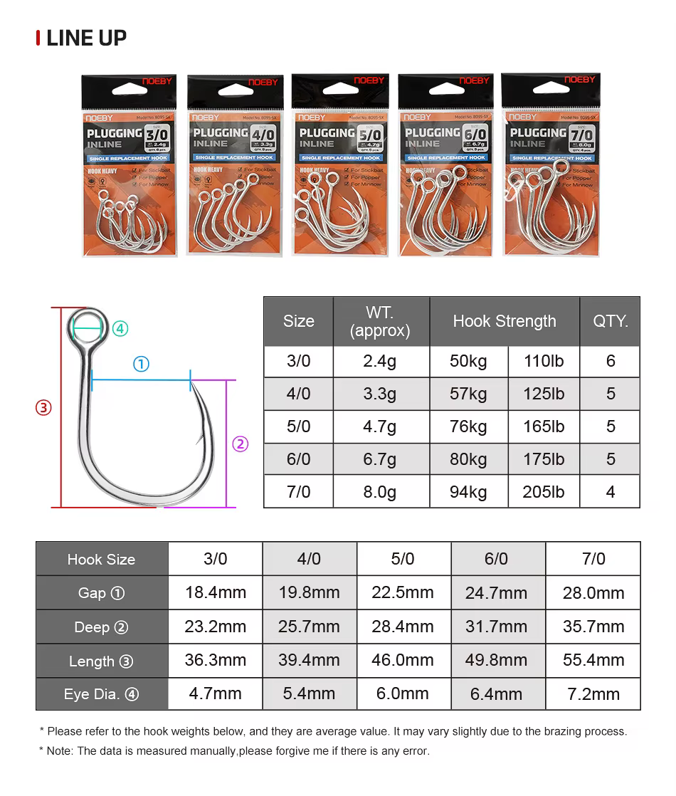 Designed to fit perfectly with NOEBY plug lures, this replacement hook features a streamlined inline design for natural bait presentation and improved hooking efficiency. The 5X strength rating ensures it can withstand the toughest battles with big game fish, while its ultra-sharp point guarantees quick, secure penetration every time.