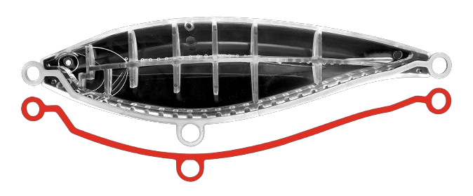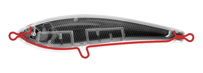 Through wire construction uses a solid piece of heavy wire that runs from the nose of the lure, through to the tail hook for extra strength and durability.